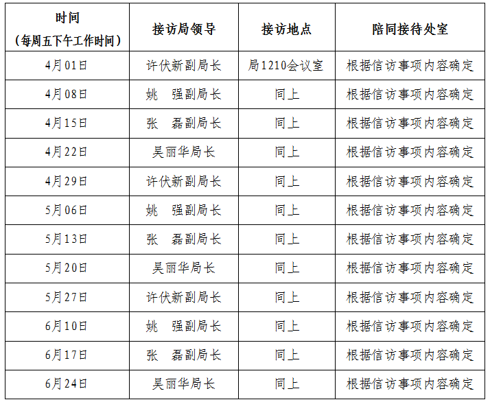 备注为提高信访接待质量,来访人应事先联系并提交相关信访资料,经审核确需现场接访的,安排局领导及相关处室陪同接访;如属一般性信访事项或投诉咨询,经来访人同意,可按一般程序直接交相关职能处室办理。局领导工作分工详见AG百家乐网站“AG百家乐娱乐”栏目。信访联系电话:,邮箱: