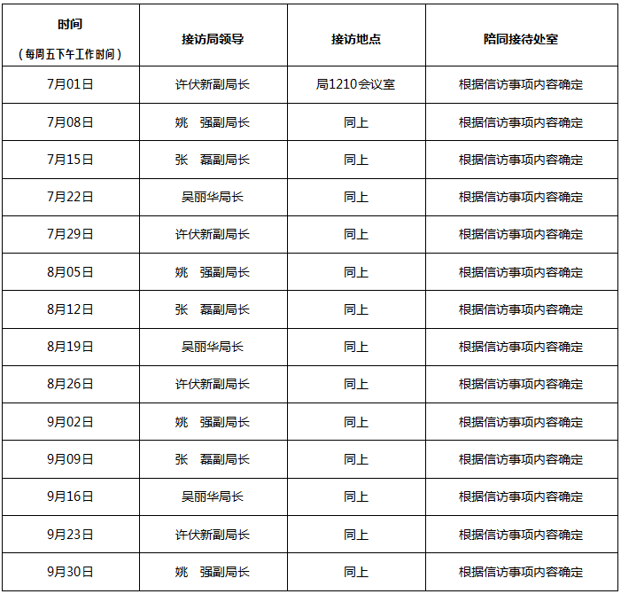 备注为提高信访接待质量,来访人应事先联系并提交相关信访资料,经审核确需现场接访的,安排局领导及相关处室陪同接访;如属一般性信访事项或投诉咨询,经来访人同意,可按一般程序直接交相关职能处室办理。局领导工作分工详见AG百家乐网站“AG百家乐娱乐”栏目。信访联系电话:,邮箱:
